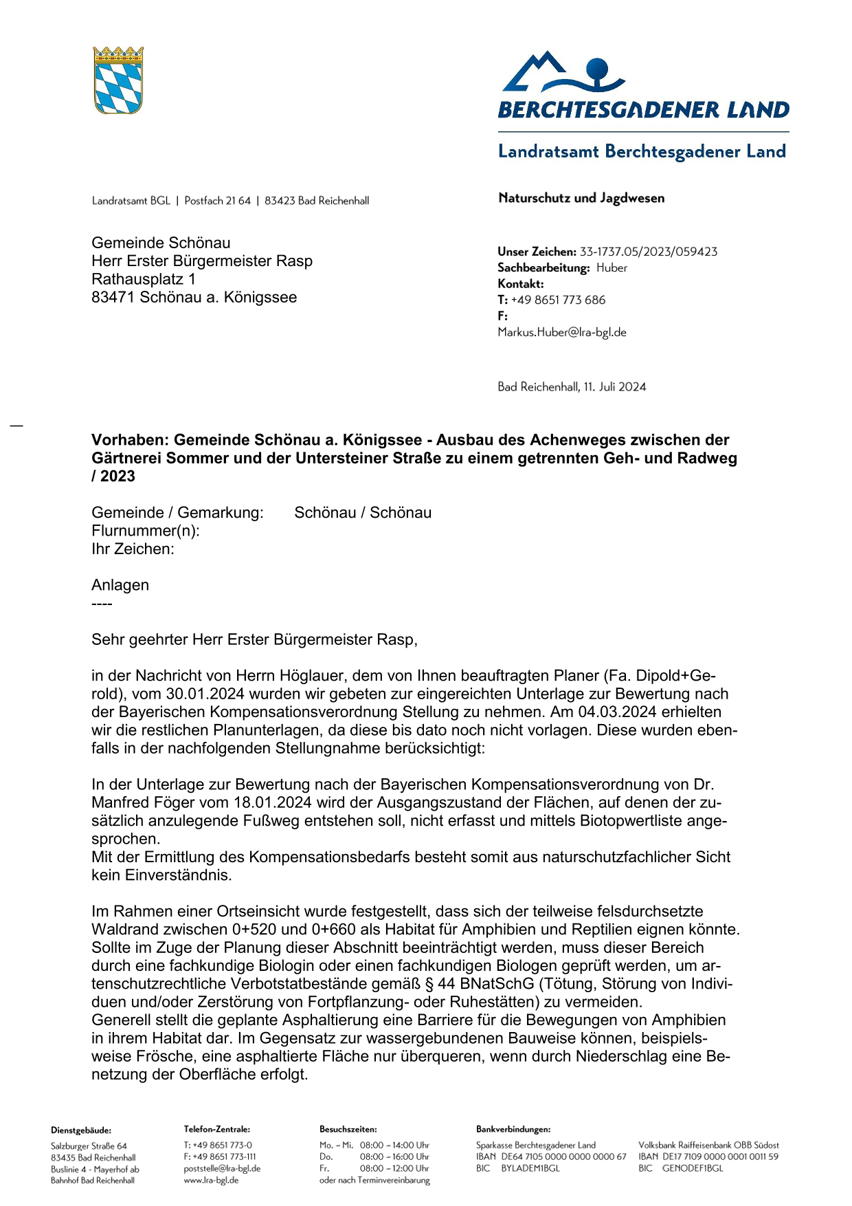 Obwohl der Fachbereich Fachbereich Naturschutz und Jagdwesen des Landratsamts Berchtesgadener Land die der Gemeinde Schönau am Königssee wie folgt anweist "Zusammenfassend ist daher nach derzeitigem Kenntnisstand die Asphaltierung und der Ausbau des Achenweges aus Sicht des Naturschutzes abzulehnen und im Sinne des Vermeidungsund Minimierungsgebotes nach § 13–17 BNatSchG als vermeidbarer Eingriff zu unterlassen." will die Gemeinde trotzdem den schönsten deutschen Wanderweg asphaltieren! Aber das will die Gemeinde Schönau: Die vollständioge Stellungnahme des Fachbereichs Fachbereich Naturschutz und Jagdwesen des Landratsamts Berchtesgadener Land für das PDF-Dokument hier klicken)