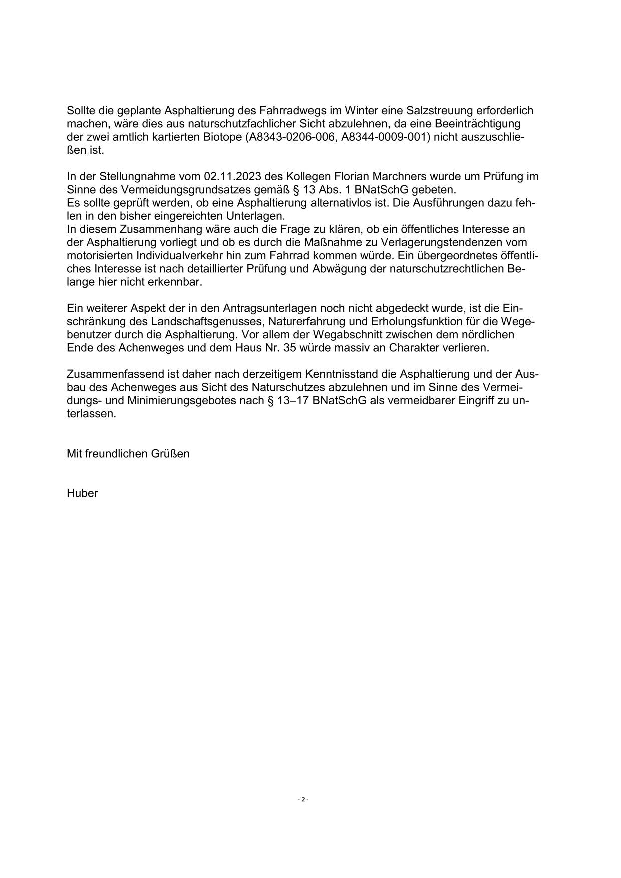 Obwohl der Fachbereich Fachbereich Naturschutz und Jagdwesen des Landratsamts Berchtesgadener Land die der Gemeinde Schönau am Königssee wie folgt anweist "Zusammenfassend ist daher nach derzeitigem Kenntnisstand die Asphaltierung und der Ausbau des Achenweges aus Sicht des Naturschutzes abzulehnen und im Sinne des Vermeidungsund Minimierungsgebotes nach § 13–17 BNatSchG als vermeidbarer Eingriff zu unterlassen." will die Gemeinde trotzdem den schönsten deutschen Wanderweg asphaltieren! Aber das will die Gemeinde Schönau: Die vollständioge Stellungnahme des Fachbereichs Fachbereich Naturschutz und Jagdwesen des Landratsamts Berchtesgadener Land für das PDF-Dokument hier klicken)